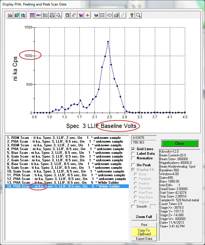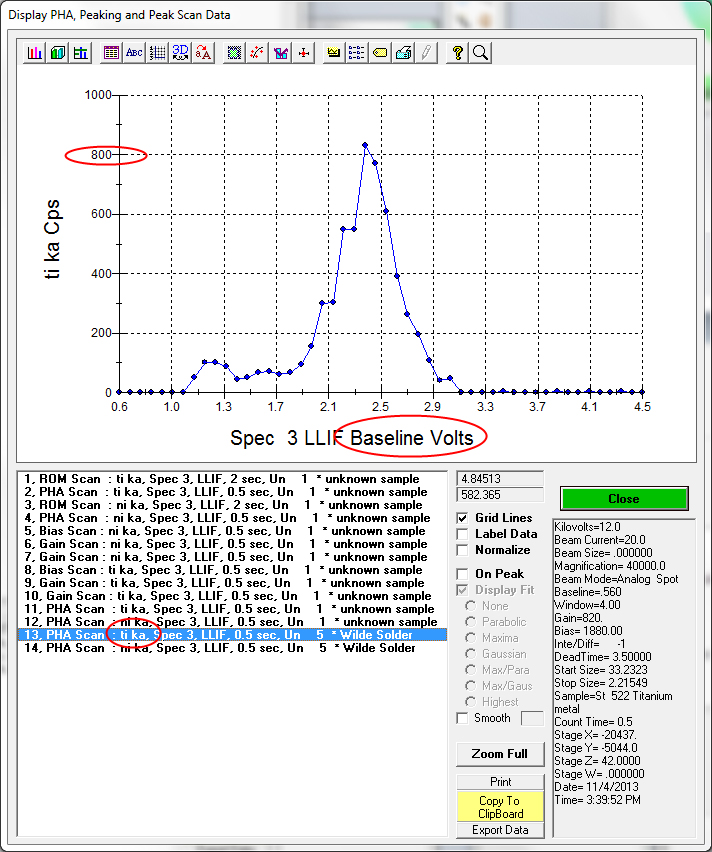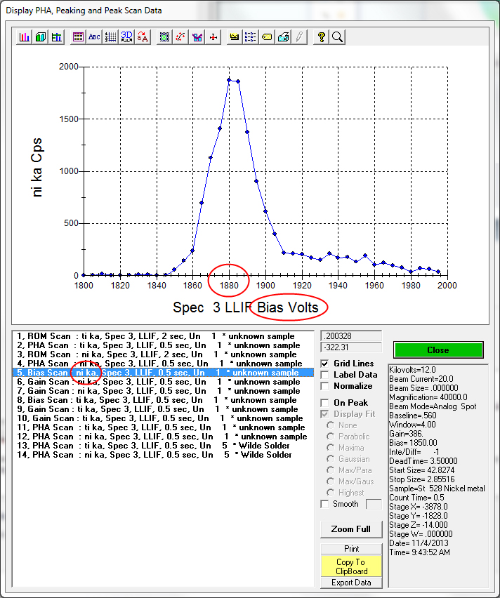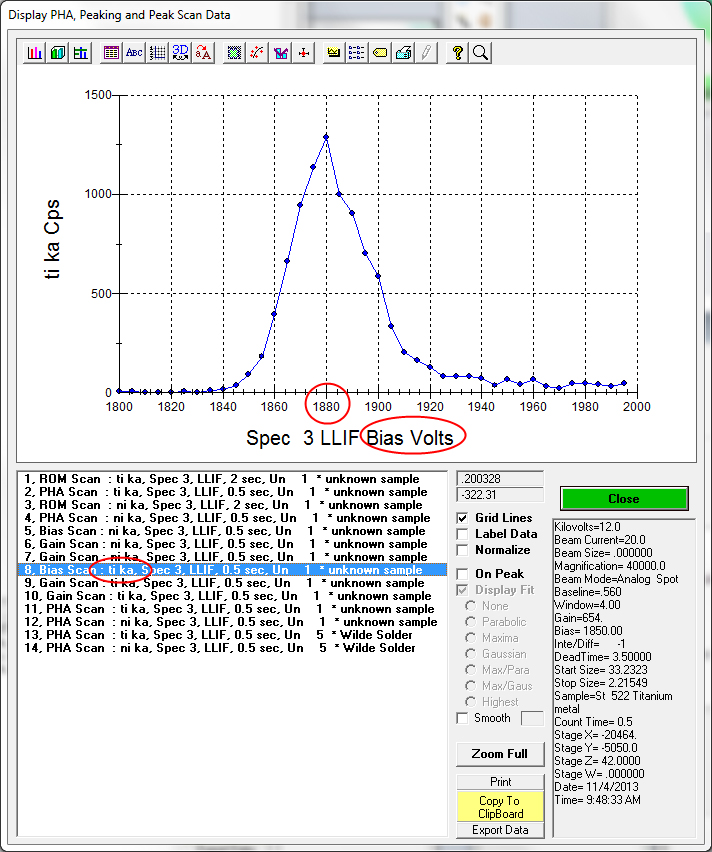 So, about those PHA scans? Well they agree with the standardization data. Basically we ran bias scans on both elements and they both showed an optimum voltage of around 1880 volts as seen here for Ti Ka: