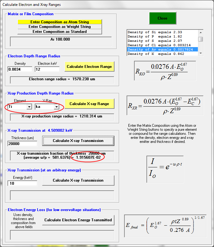 This makes a lot of sense because the MAC for Ti Ka in Ar is 581 and the MAC for Ni Ka in Ar is only 145. In fact, if we do the same calculation for Ti Ka in CalcZAF, we see that almost no Ti Ka x-rays are transmitted through the detector and instead get counted properly: