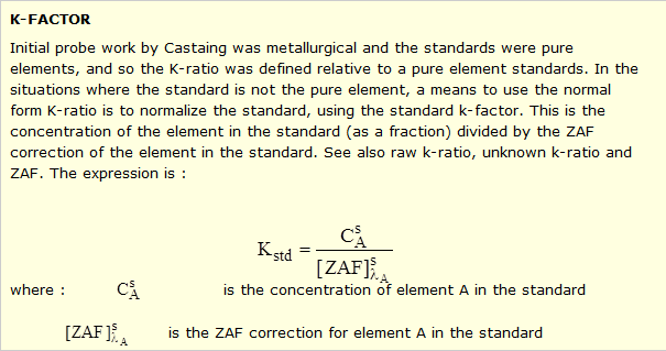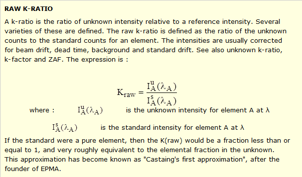 The above image is from the glossary in the Probe for EPMA help file (which is also distributed with the CalcZAF EPMA utility). To download CalcZAF, see the first post in this topic. This ratio should be reproducible when two materials (unknown and standard) are measured on any instrument with the same electron beam energy and detector takeoff angle (hence the need for globally agreed upon standard compositions!).