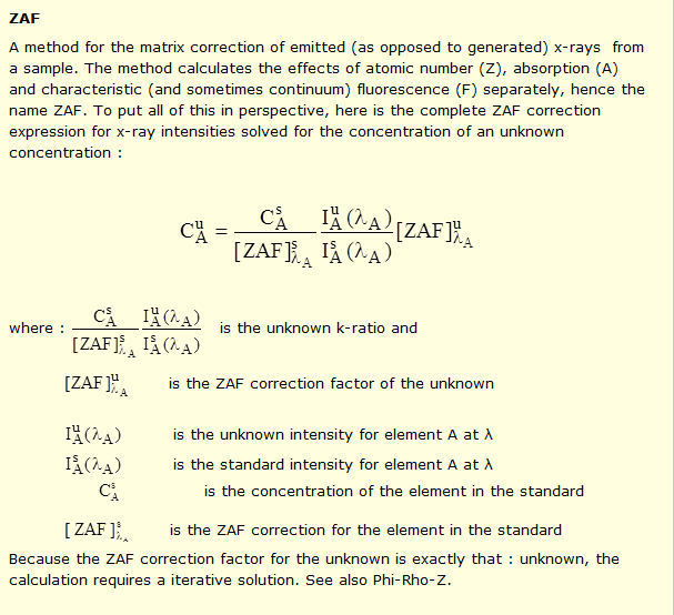 Note also that the term [ZAF], refers to *any* matrix correction scheme including pr(z) methods. The difference in pr(z) methods is that the absorption (A) and stopping power and backscatter terms (Z), are treated in a single analytical expression. The fluorescence factor (F) is treated separately. Alpha factor methods would utilize the so called "beta" term.  But we simply use the [ZAF] term to describe them all.