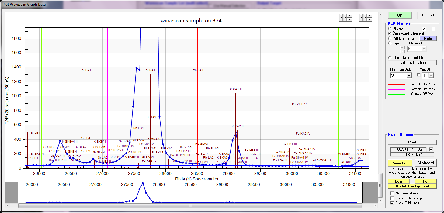 Note that on PET the Rb La line is up against the high spectrometer limit, while on TAP, the emission line is almost to the bottom of the spectrometer range.