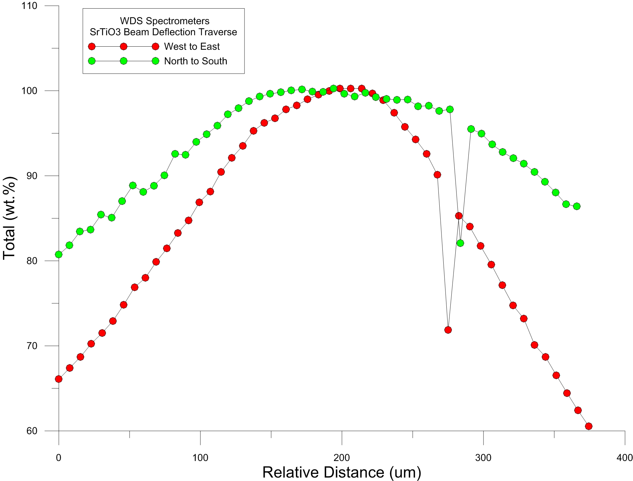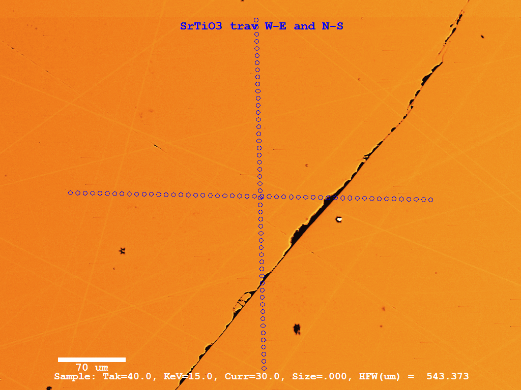 So I decided to perform a test on my Cameca Sx100 by tuning up a number of elements and acquiring a beam deflection analysis on some standards. In this image we see the SrTiO3 standard and two traverses digitized (roughly) west to east and north to south. The data was acquired by moving the stage to the center of the digitized image and utilizing beam deflection to move the beam to each traverse position.