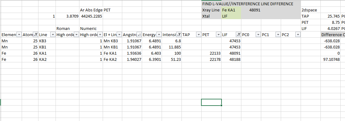 In the example below - looking at Fe KA1. Elements of atomic number <30, x-rays lines with intensity > 1% and LIF range 47000 to 49000 are shown. Mn Kb1 is seen to occur at -638