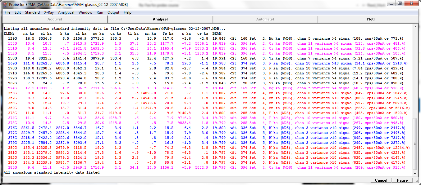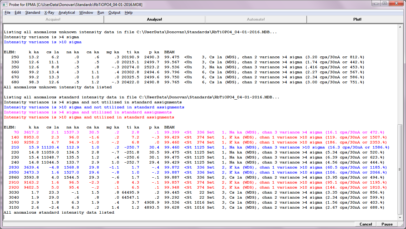 Note the unknown intensities listed at the top, and the standard intensities listed below. The idea is that when listing anomalous standard intensities, one would want to be alerted to anomalous intensities which are being utilized as ones primary standard (text in magenta or red).