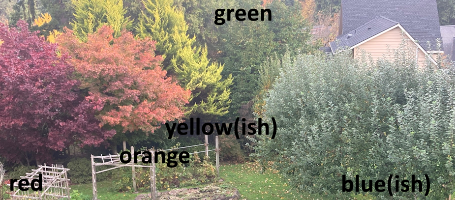 This fall has quite colorful, enough so that I can almost see a "full spectrum" from our house: