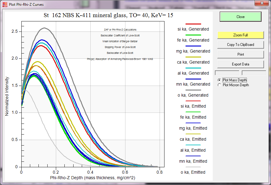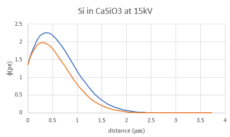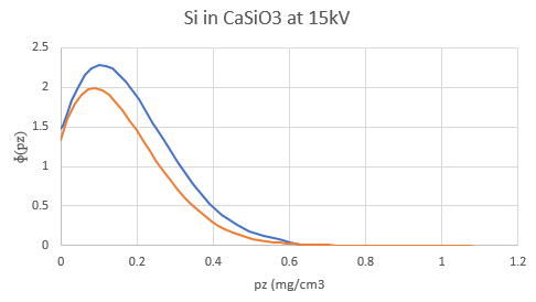 As many of you know, the PAP prz method is interesting because it attempts to be physically accurate with regard to depth as opposed to other analytical models that focused primarily on the area under the curve (the genesis of PAP was thin film modeling by Pouchou). However, the validity of area under the curve analytical models is demonstrated by the surprising accuracy of the Love/Scott quadrilateral "prz" method which assumes the x-ray production distribution curve with depth is a rectangle!  But since we're essentially comparing the ratio of the calculated intensity in a pure element with that of the compound, shape really doesn't matter.