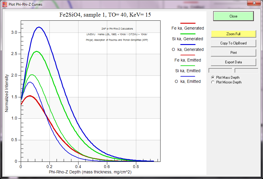 With Brian Joy's help we implemented prz plots for the PAP and XPP methods in CalcZAF v. 12.3.3.  Here is a plot of the PAP curves for Fe2SiO4: