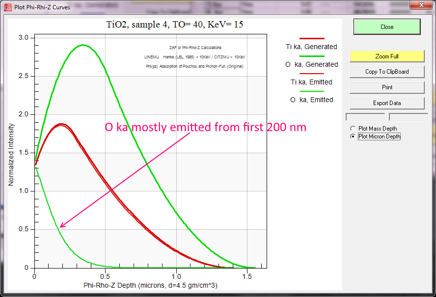 Here we can see that although oxygen x-rays are generated at a considerable depth, the O Ka x-ray emission volume is mostly within the top 200 nm of the sample.  Download the latest CalcZAF 12.3.3 and try the same calculation but with the formula Ti99O or TiO99.