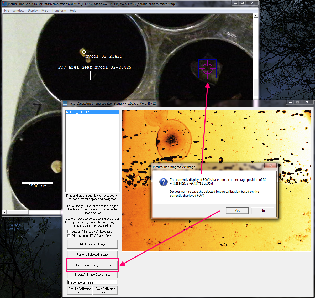 and then browse to the "remote" image previously acquired using the instrument OEM software.  The software then confirms the stage position and magnification, then when the user clicks Yes, the image is loaded and calibrated based on the current stage position and FOV as seen here: