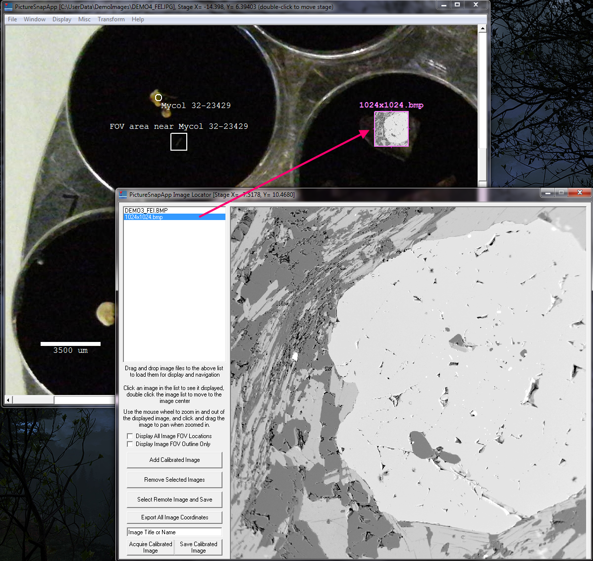 Again, the idea being that one can acquire an image on the OEM system as one already does, save it as usual to the hard drive. And then *without* changing the stage position or FOV on the instrument, simply browse to the location of the saved image file (perhaps using a shared folder link) and then select that image into PictureSnapApp which then saves the image calibration based on the current FOV, which is always up to date in PictureSnapApp (for the hardware enabled versions at least).  The image and calibration files are then automatically saved to the current PictureSnapApp main image folder, and loaded in the Image Locator image list.