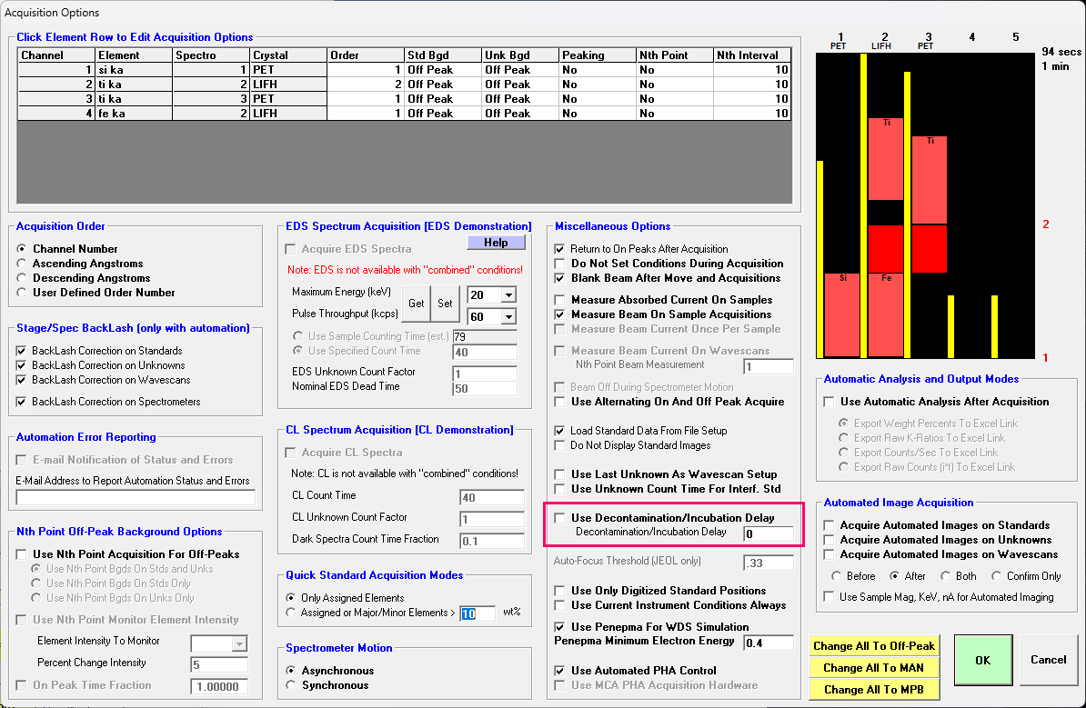 I think the best compromise for JEOL instruments might be to set FaradayWaitOutTime to zero in the Probewin.ini file (for timely TDI measurements), then set the Incubation/Decontamination delay time (in the Acquire! | Acquisition Options dialog) from zero to a couple of seconds when you aren't measuring TDI but need to obtain accurate absorbed current measurements.