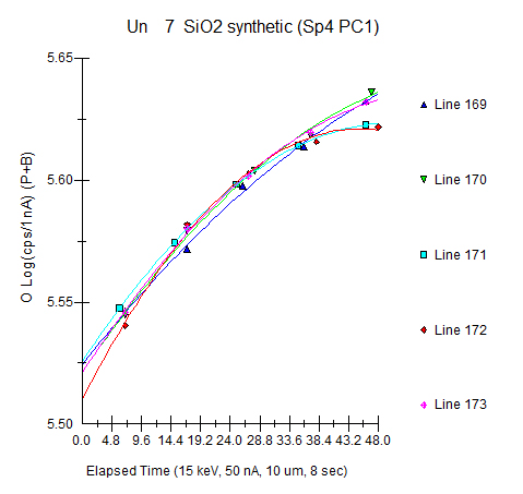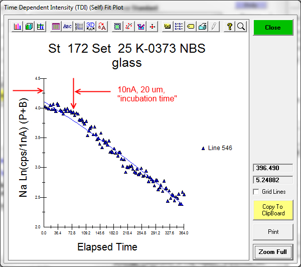I suspect that what we are seeing here with this "incubation time" is the warming of the sample by the electron beam. That is to say, ion migration of alkali elements towards the sub surface charge implanted by the electron probe does not start, until the sample spot is heated sufficiently. This hypothesis is further supported by a number of acquisitions where it is observed that it is the first point that almost always shows this "incubation time" effect most strongly. In the previous 10 nA, 20 um beam TDI acquisition it can be seen by displaying all the data points for the sample as seen here: