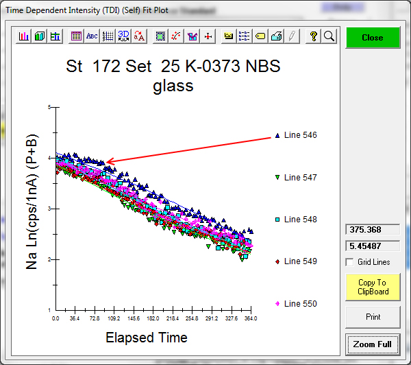 Just to be sure it did not actually do the calculated intensities with TDI even though the TDI buttons are not apparently active, you can run analyze before going back to check the standard assignments to see the results, then go into standard assignments and check the use TDI (self) buttons and re-run analyze.  Sure enough, the results change as they should (in this case to very slightly lower the intensities, as counts for these three elements are all slightly increasing with time).