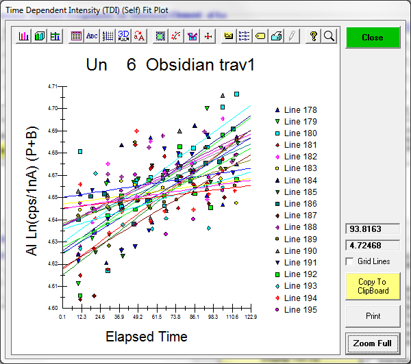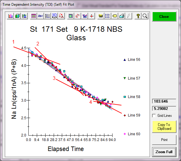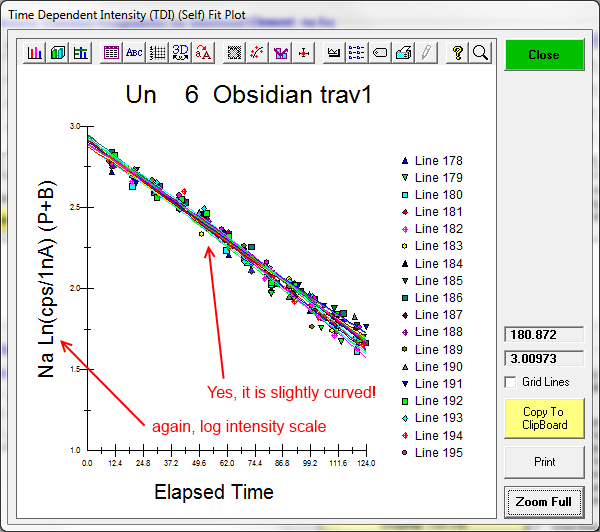 So what's next?  Let's examine some other TDI acquisition log slopes more carefully, starting with this acquisition on yet another high Na NIST glass (K-1718) at 10 nA and 10 um, which shows several slopes in exponential space as seen here: