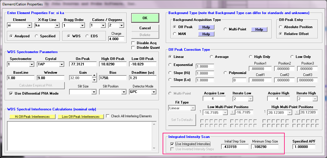 Another alternative for APFs is to utilize the "integrated peak intensities" acquisition option. This tells Probe for EPMA to acquire a full scan on each peak, as opposed to just the peak intensity. That is to utilize the integrated intensity as opposed to just the peak intensity to deal with chemical states causes shape changes in the peak. This option is here in the Elements/Cations dialog: