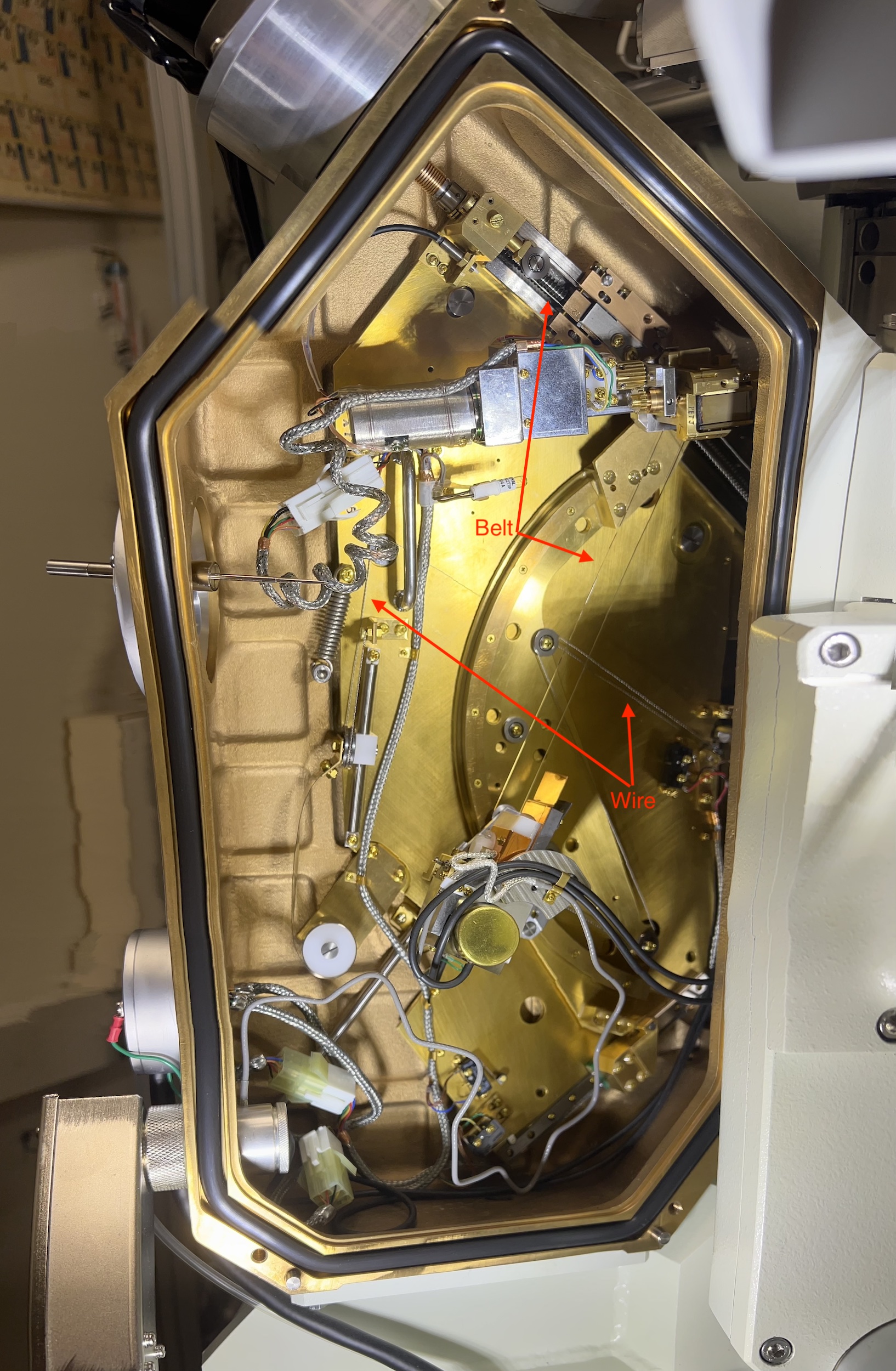 It is indeed the braided wire and not the belt that continuously fails. It's possible that the JEOL service engineer is missing something but it also could be a manufacturing defect with this spectrometer. The wire is the piece that fails most frequently on it but I have had to replace the motor O-ring multiple times, the belt has gone twice and the detector has had to be replaced. I think I just got a lemon SP2!