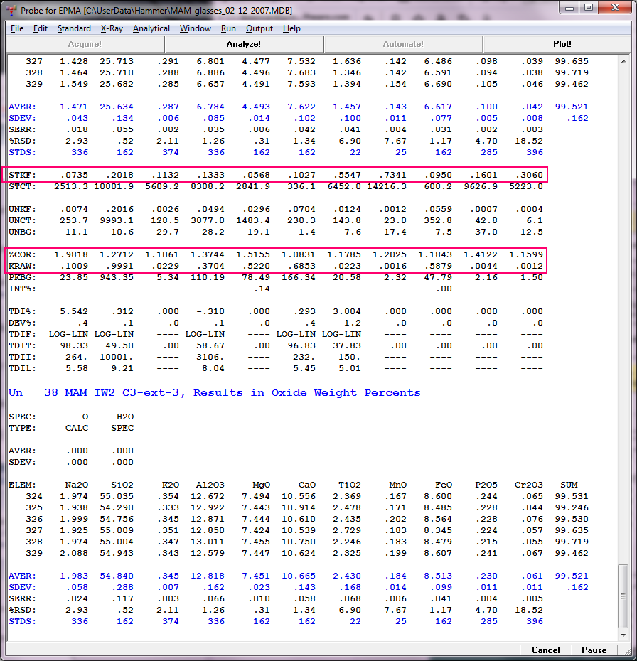 Finally we can note the "ZCOR:" line in the Probe for EPMA output, which is the matrix correction for the unknown sample, again remembering that this value applies to both ZAF and pr(z) matrix corrections (when using alpha factors for quantification, this line would be labeled "BETA:" for the so called "beta" factor).