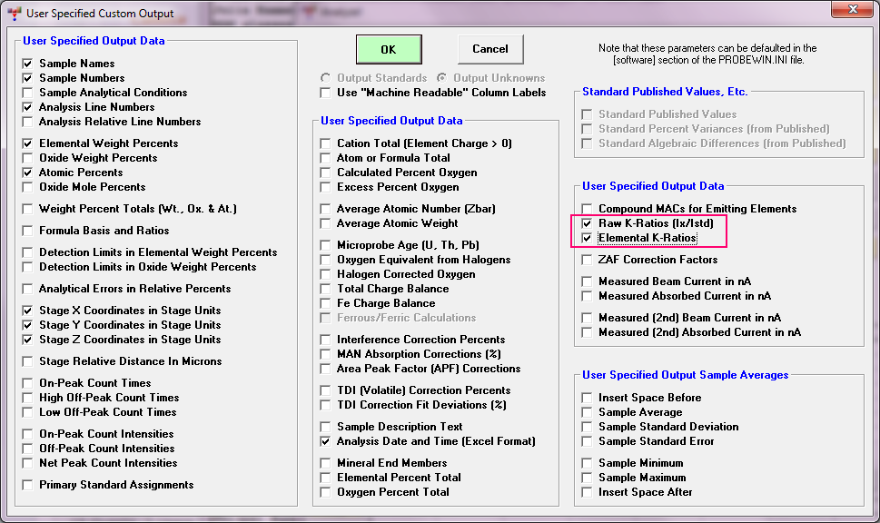 Now what about the so called "elemental" k-ratio in Probe for EPMA?  Well, it's not displayed normally in the log window output (though turn on DebugMode from the Output menu and you'll see the elemental k-ratio, a la CalcZAF, along with a host of other parameters for your EPMA enjoyment), but you can obtain both the "raw" k-ratio and the "elemental" k-ratio from your Probe for EPMA data by using various other export options such as the "User Specified Output Format" option shown here: