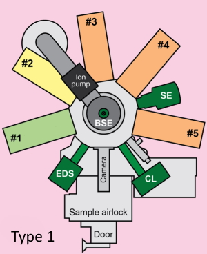 Based on rotation angles with 0 degrees at the top (North or back) of the instrument and starting with the lower left spectrometer (which we refer to as a Type 1 JEOL spectrometer orientation)  and proceeding clockwise we obtain these rough numbers: