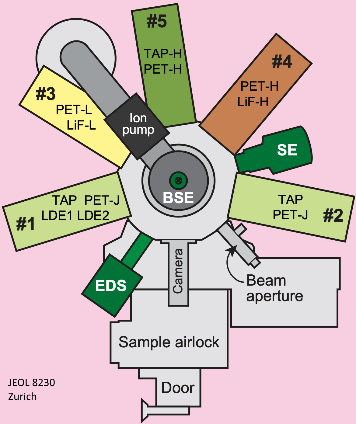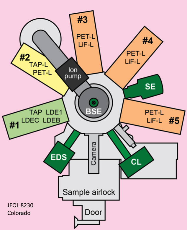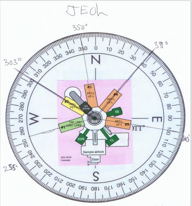 In the above post we attempted to determine the spectrometer orientation angles for JEOL EPMA instruments. I'm hoping that someone out there has a JEOL schematic which would provide the actual angles for the WDS spectrometers.