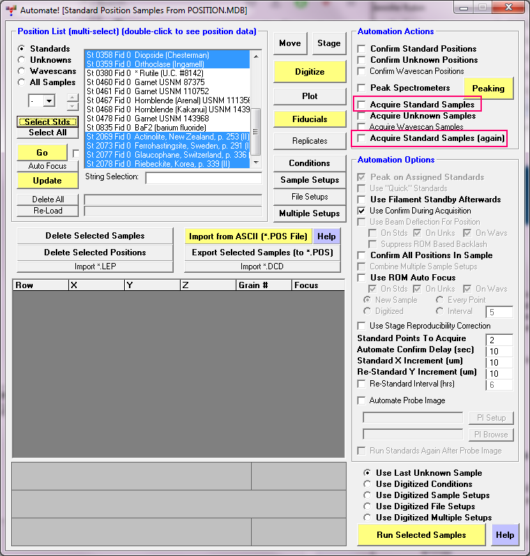 Note also that Probe for EPMA automatically applies a standard intensity drift correction (which can be turned off from the Analytical | Analysis Options menu dialog), which means that it will apply a linear drift correction between each standardization for any samples in between those standardizations.