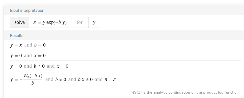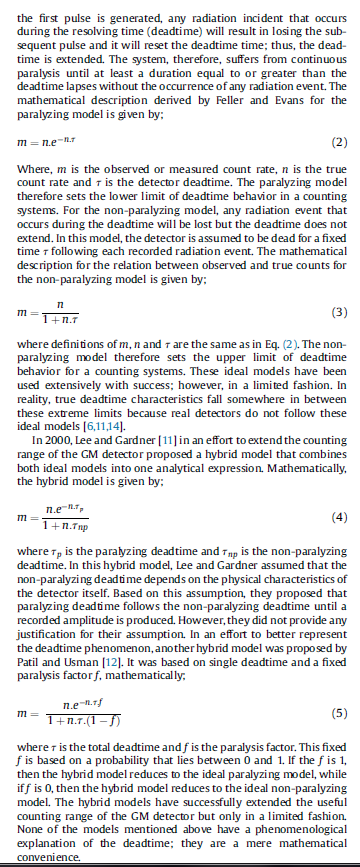 where x is the observed count rate, y is the predicted count rate and b is the dead time constant.  When solving for the predicted count rate, W is the log product which has to be solved iteratively.  We utilized the method of Lambert.