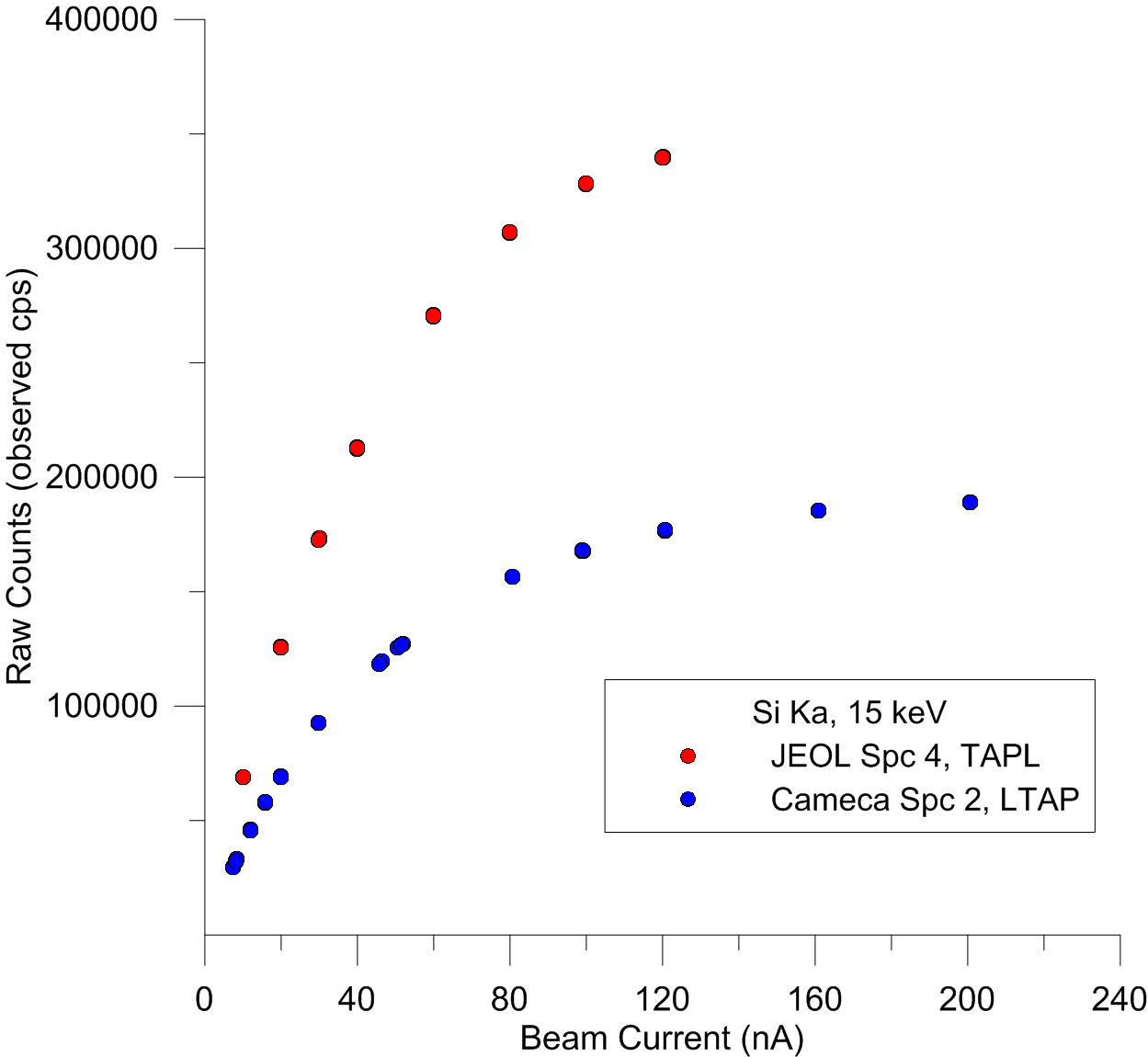 But remember, one must carefully adjust their PHA settings to keep their PHA peak above the baseline to avoid affecting the measurement.  I suggest performing PHA scans at several beam currents over the range being utilized for these tests.  The JEOL seems to be more susceptible to pulse height depression so it is especially important for that instrument to monitor the PHA peak as the beam current is increased.