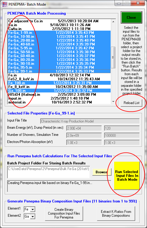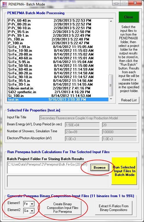Select your binary elements, Fe and Ga in this case, and a folder so the results will be automatically stored for you. When you are ready click the Create Binary Composition Input Files For Penepma and the program will create the 11 binary compositions and pure element end-members as seen here: