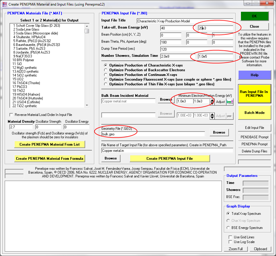 Start by running Standard.exe and clicking on the Analytical | Penepma (Monte-Carlo) Calculations menu. First confirm the electron energy, minimum photon/electron energies, geometric model (for matrix corrections always choose the "bulk.geo" file)  and the calculation time per material as seen here: