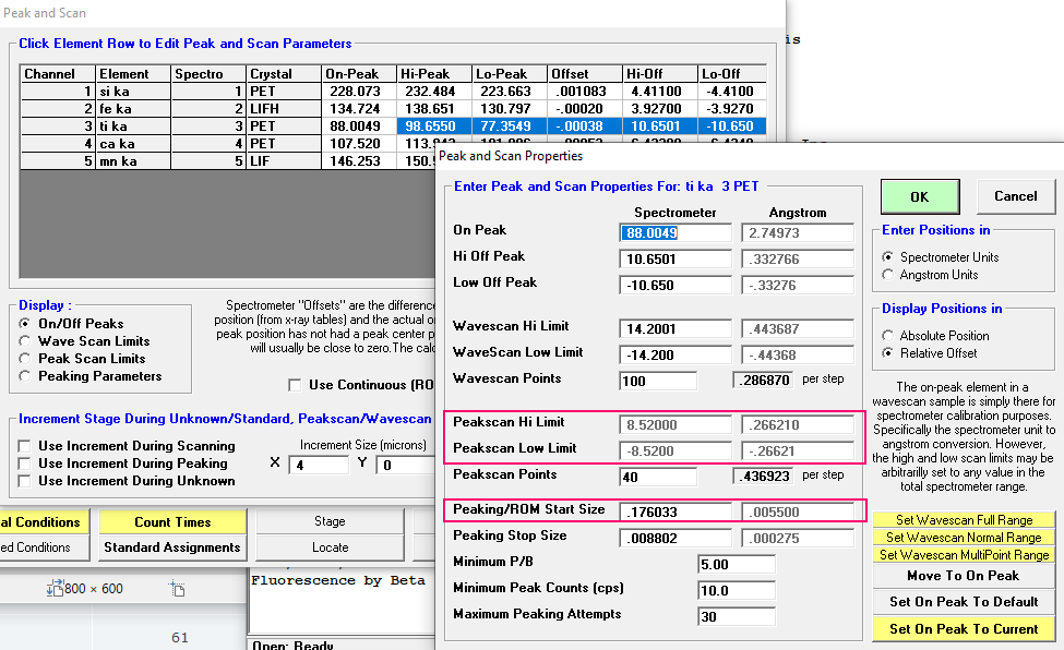 Or potentially I could decrease the interval range of peak searching. For instance, in Peak/Scan (Acquire! window) the interval range of peak searching for O Ka by default is +/- 21.3 spectrometer units, I want to try +/-5; the interval range of peak searching for Fe Ka by default is +/- 2.8 spectrometer units, I want to try +/-1.5 etc. How I can change these ranges by default because now the boxes are gray (not active).