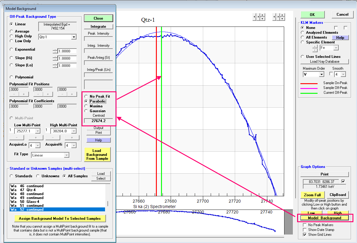 That is, first zoom in on the peak area of interest, then use the Model Backgrounds button to load the Model Background dialog and then selecting one of the peak fitting options as shown here: