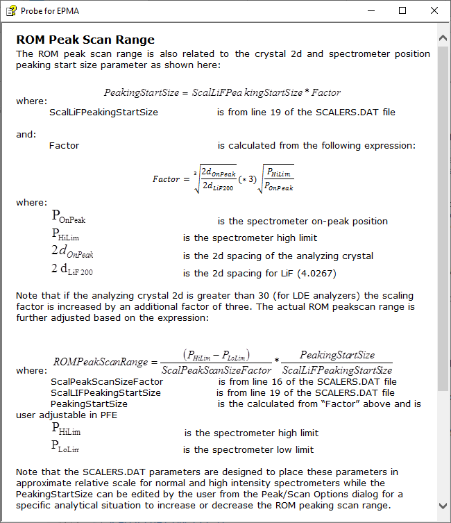 As I stated above all this information is in the Probe for EPMA User Reference Manual which is available as a pdf from the Help menu or by hitting the F1 key and browsing to the ROM peaking size range section in the description of the SCALERS.DAT in the Configuration Files section as shown here: