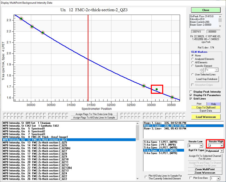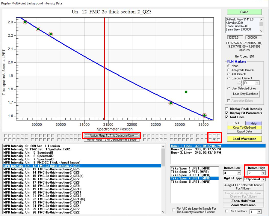 Below is a sample with three lines of data (Lines 32,33,34). I go to Line 32 and for whatever reason one of the Hi background points needs to be kicked out on Sp4, that's fine, so I select Iterate High 2, tick the flag box for that data point, and hit the "Assign Flags To this Data Line Only".