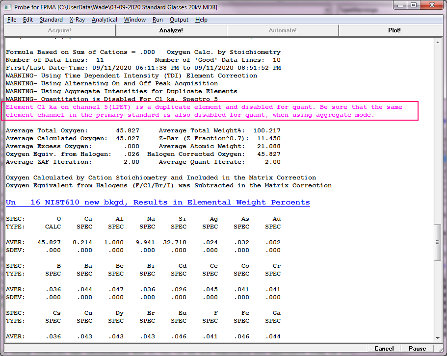 And now the average Cl is significantly lower. How is this possible?  The answer is that because one of the unknown elements was disabled for quant, but the same element channel in the standard was *not* disabled for quant, the k-ratio was improperly constructed.