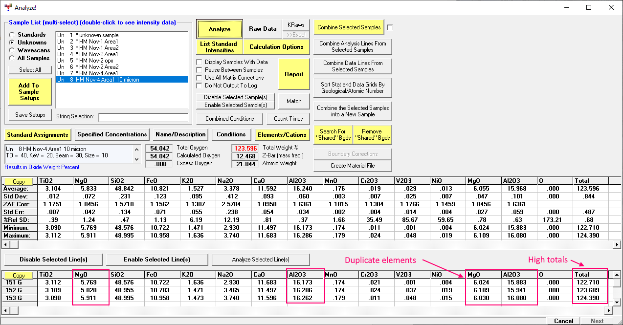 Note that because Al and Mg are major elements, the totals are too high and of course this affects the overall matrix correction adversely for all the elements. Note that if these duplicate elements were only present at trace levels, these adverse matrix effects would be minimal.