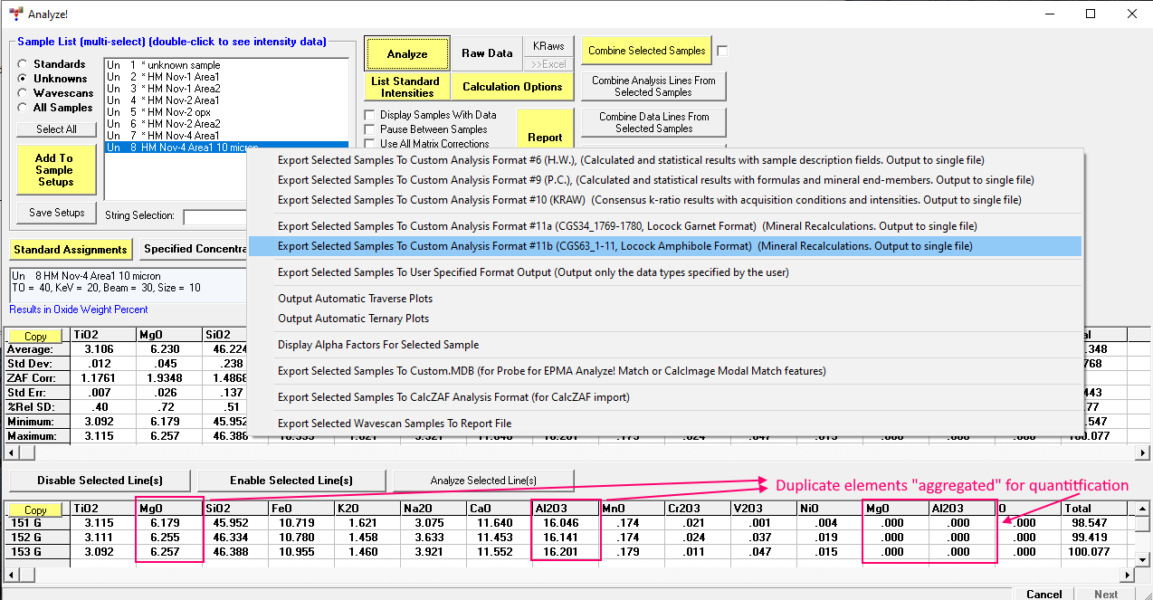 Note also that I've highlighted the Locock amphibole export menu in the Analyze! window.  This is where Andrew found a problem because the amphibole export code was looking for each element and loading the results into the export format. But since the duplicate elements are after the first instance of the elements, these zero values from the duplicate elements were loaded into the exported file.