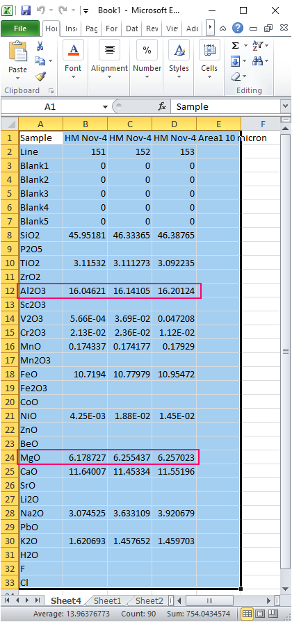 Note that the duplicate elements are now zero. This is because the intensities of these duplicate elements (from the unknowns *and* standards) has now been summed into the first instance of these elements.