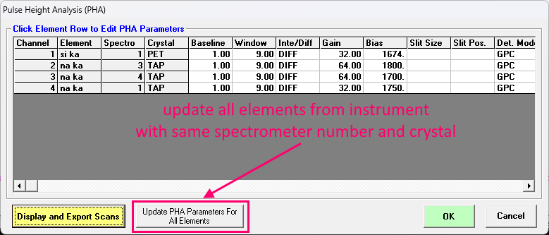 Gareth Seward asked for a new button in the PHA dialog that will update the PHA settings for all elements in a sample from the current PHA settings on the instrument:
