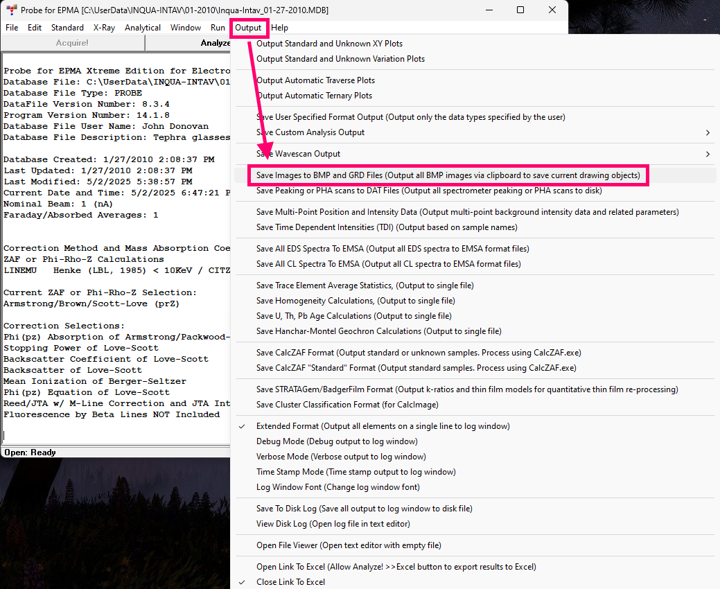 Then, open Probe for EPMA on your off-line computer, click "No" when asked whether you want to interface to the instrument, and then open the probe database from your on-line computer. Then click on this menu: