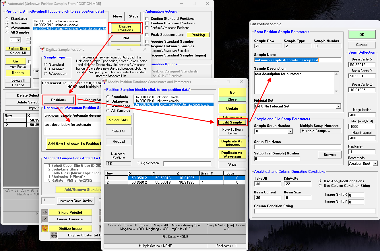 First, for the standards database file, does it contain X,Y, and Z positional information that can quickly be accessed to drive the stage to the standard. I often just want to go to benitoite (as one example) to set up the beam and the optics, but I am not using that standard in the analytical routine. At present, you have to load or start a database file, load the standard, then go to another option, such as Automate, to double click and move to the standard position. Is there a shorter means of doing this? Seems like this should be easy, but I don't do programming......