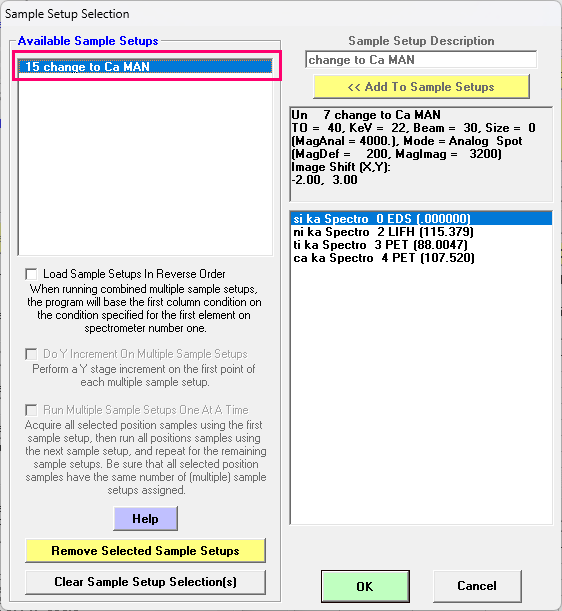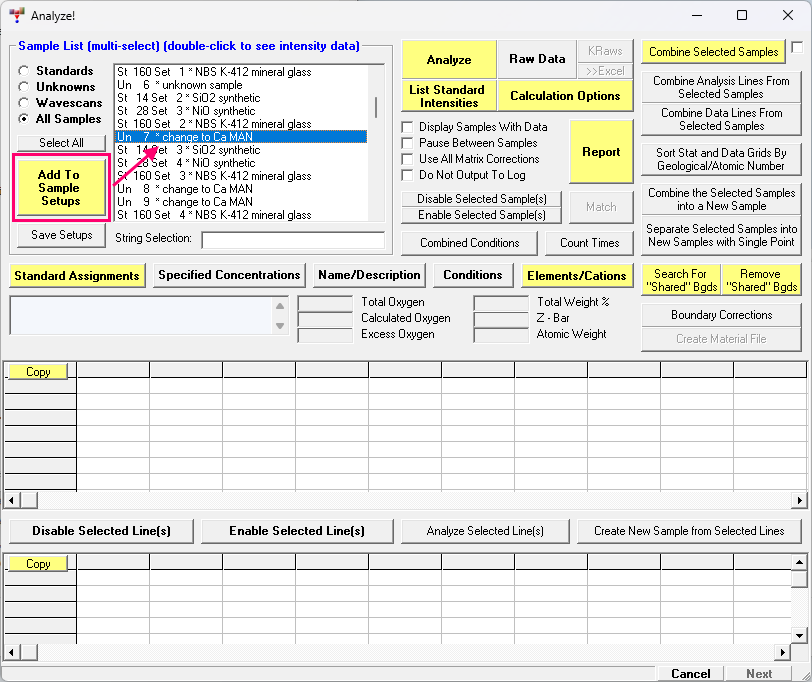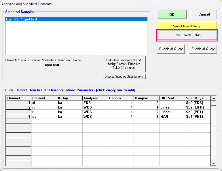 Note that one can also view/edit the list of sample setups from the Elements/Cations dialog in the Analyze! window as seen here:
