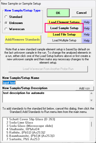 For example, let's say that you are working with more than one sample setup with different analytical elements (e.g, silicates, sulfides, oxides, etc.), and you wanted to check your off-peak backgrounds for each different sample setup once they were peaked up and had their PHAs adjusted. So after each each sample setup is peaked and PHA'd, you make sure the Use Last Unknown as Wavescan Setup is checked, and when you create a new wavescan, the new wavescan will be based on the last unknown setup, whatever it is.  Then create the next new sample setup, and peak and tune that up, then again create a new wavescan based on the last unknown.