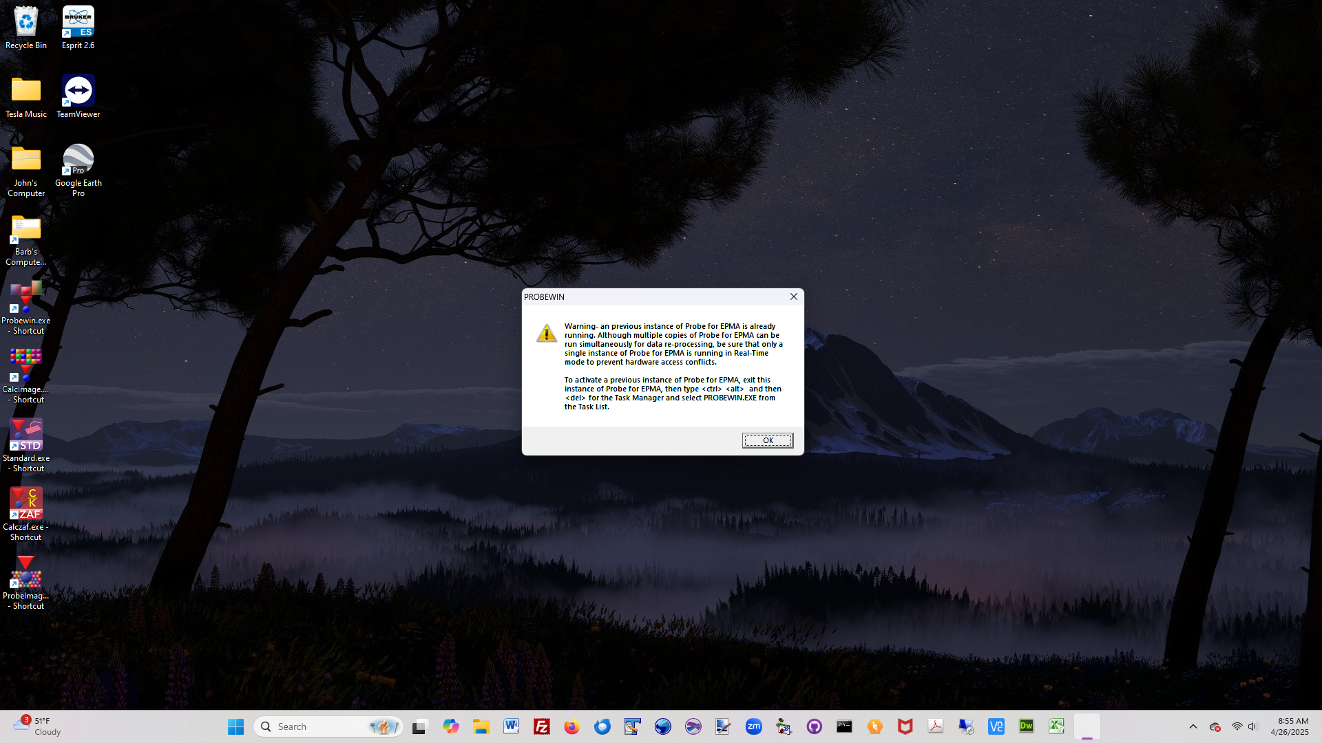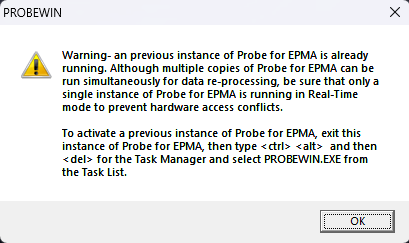 For example, let's say you are running Probe for EPMA to acquire new data from your instrument, but you want to look at some data from a previous run. When you start another instance of Probe for EPMA the software will warn you that another copy of Probe for EPMA  is already running and therefore not offer to connect you to the instrument: