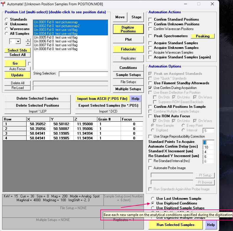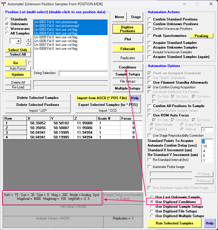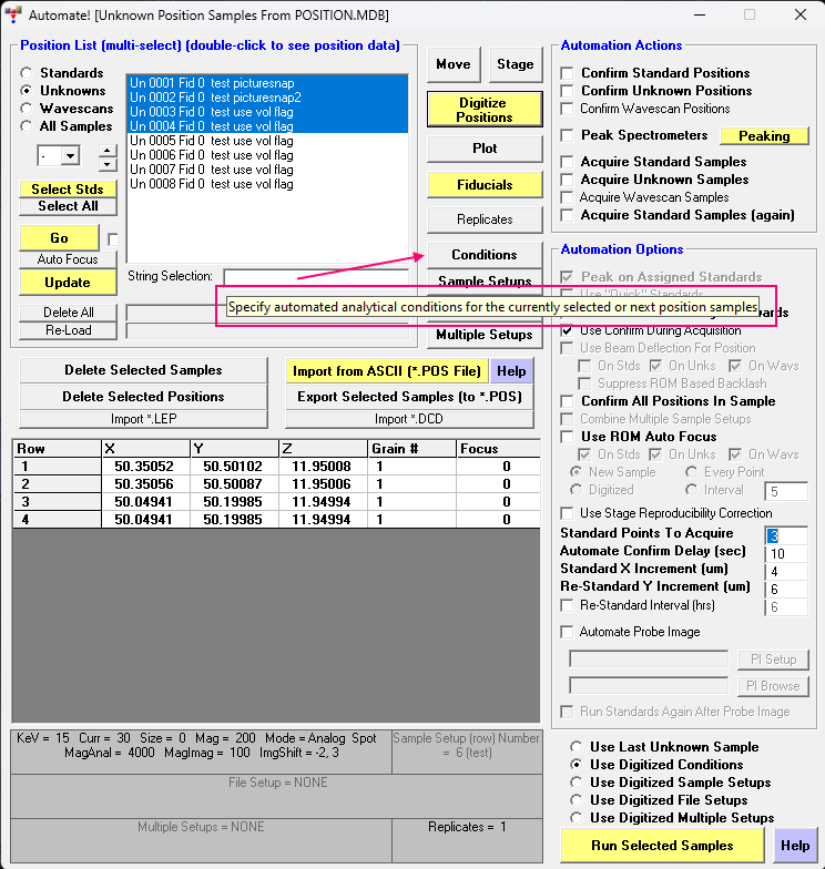 To "store" different conditions for different position samples, simply click the Conditions button and edit the beam conditions as desired.  These various beam conditions are stored in the position database for subsequent use.