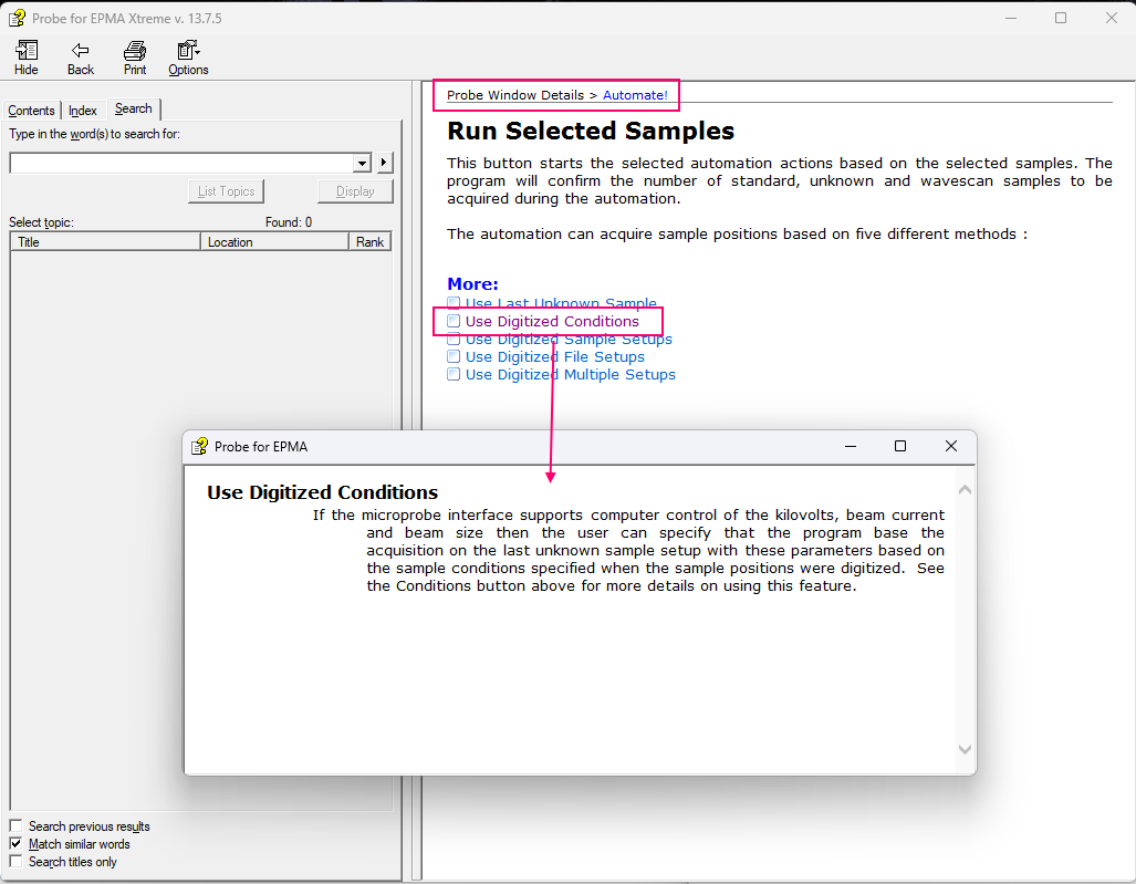 For example, in the Automate! window, hitting the F1 key loads the reference manual and displays the section on the Automate! window. Then scroll down and click on the Run Selected Samples link, then click on the Use Digitized Conditions link and the following will be displayed: