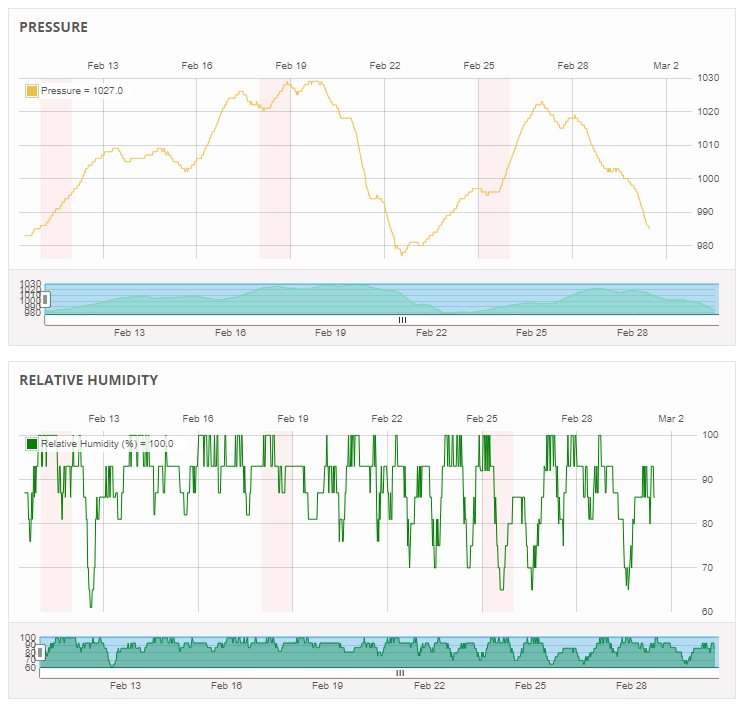 That is a pretty big drift in the data for barometric pressure changes. Of course, it depends on the instrument's location but usually, I feel the data drift is more subtle even on my previous probe in the Midwest where weather changes come in all caps and with exclamation marks.