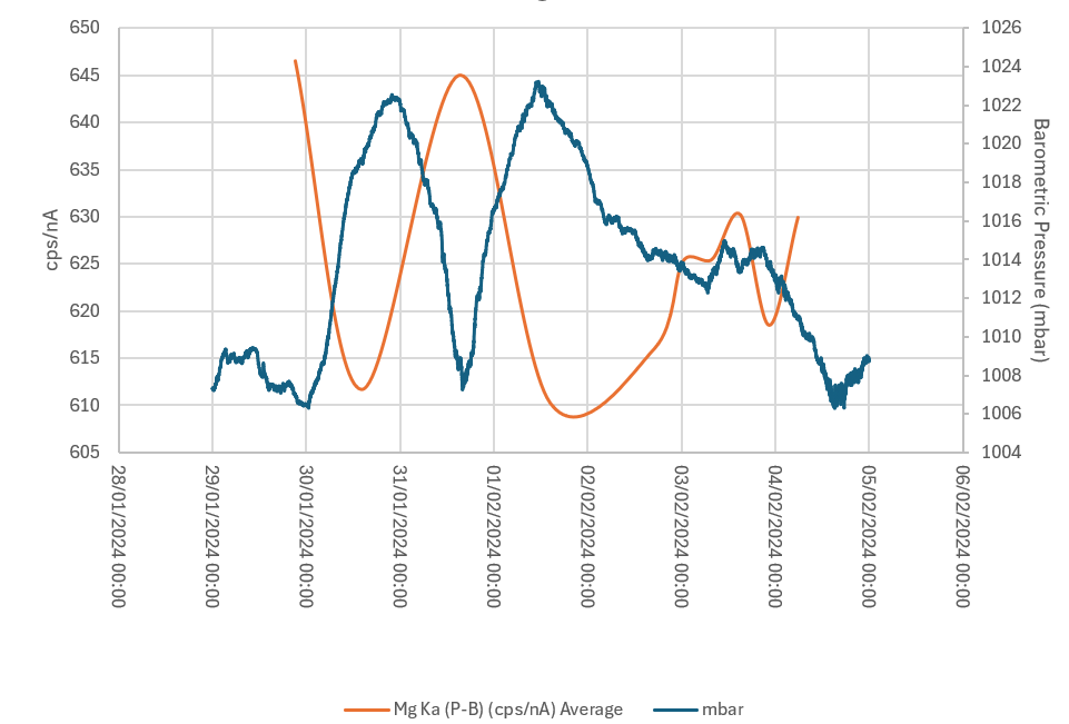 We can get pretty big swings of 50mbar or more over a few days (see below) and this can cause havoc on our standard intensities, meaning we have to re-standardise frequently.