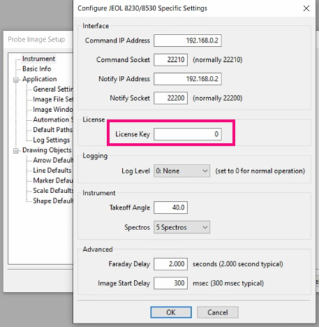 After a few days of communication with Henny we discovered that somehow (she has no idea how), the JEOL security number had been deleted from the Probe Image configuration dialog on her computer:
