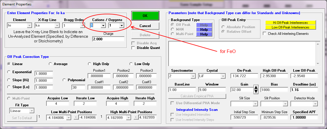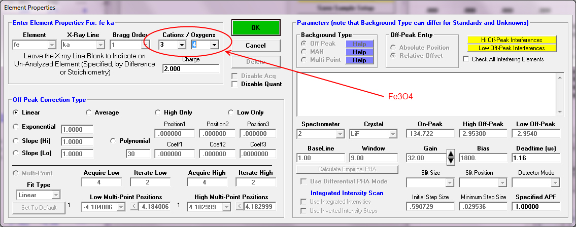 Above the Fe is calculated as FeO, so in magnetite (Fe3O4), we see an excess of oxygen. Now by adjusting the Fe cations and oxygens as seen here from the Elements/Cations button in Analyze! we can set them to any value between 0 and 99: