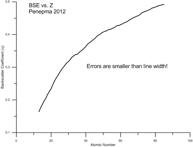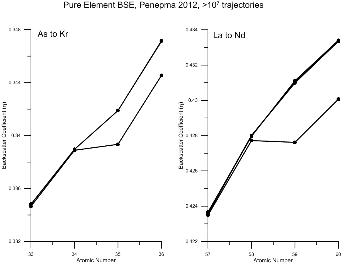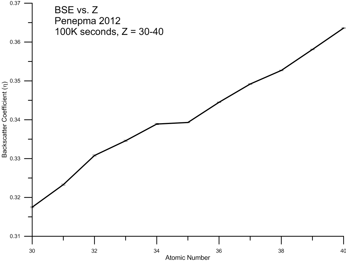 My question is: are these BSE fluctuations for these pure elements, e.g., around Z = 35 or so, we are seeing in the Penepma calculations, confirmed by empirical measurements?  What I mean, is there a physical basis for these BSE fluctuations in the Penepma modeling?  Or is it an artifact of the elastic scatter modeling in Penepma?